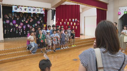遠野聖光こども園で夏の風物詩「ゆうすずみかい」が先週金曜日に開かれました。毎年の恒例行事となっている遠野聖光こども園の「ゆうすずみかい」は、園内に「スイカ割り」や「玉入れ」といった子どもたちが楽しめる縁日コーナーを作り夏祭り気分を味わう親子行事です。ことしも可愛らしい浴衣や甚平姿に身を包み保護者と一緒に集まった園児達は、それぞれ用意された催しを夢中になって楽しんでいました。じめじめした天気を吹き飛ばすかのように、笑顔と笑い声が響き渡る園児たちの元気な姿に園の職員や保護者は安心した表情を見せていました。園生活を送る子どもたちにとって、夏の思い出のひとときとなった様子でした。 Copyright(C) TonoCableTelevision. All rights reserved.