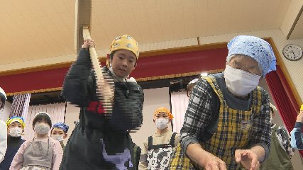 1年を通して米作りを学んできた青笹小学校の5年生が先週金曜日、青笹地区センターで、お米の収穫を祝う餅つきを行いました。青笹小学校の5年生は上閉伊酒造や遠野山・里・暮らしネットワーク、地域の人たちの手を借りながら1年間を通して米作りについて学習してきました。ことし5月に田植え体験を行い、10月には、大きく育った稲を鎌で刈り取って自分たちで育てたお米を収穫しました。この日の収穫祭では、収穫のお祝いに青笹町の農家・奥寺晴夫さんが提供してくれたもち米を使って餅つきが行われました。児童たちは、地域の人たちの手を借りながら重さが7キロほどある杵で一生懸命餅をついていました。餅つきが終わると地域の人たちがつきたてのお餅で作ってくれた磯部餅やきなこ餅を口いっぱいにほおばっていました。収穫祭の終わりには児童たちが青笹しし踊りを披露しお米作りを手伝ってくれた人たちに感謝の気持ちを伝えていました。なお、児童たちが収穫したお米は精米された後5年生27人に1sずつ配られたということです。Copyright(C) TonoCableTelevision. All rights reserved.