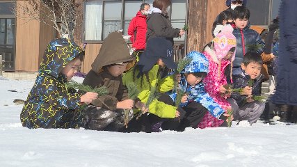 あおざさ子育て村で先週金曜日、みずき飾りやお田植えなど地域の風土を感じる小正月行事が行われました。あおざさ子育て村では、毎年、しめ縄づくりや小正月行事などを通して世代間交流をしています。ことしは、青笹児童館の小学生や青笹保育園の4歳児が参加する中、小正月行事が行われ、子どもたちが地元・青笹町老人クラブのおじいさん・おばあさんと一緒に昔ながらの伝統行事に親しみました。はじめに、ことしの豊作を祈願するためみずき飾りにつかうお団子づくりに挑戦、赤、黄色、緑に色づけされたお団子をまゆだまの形に丸めていきます。子どもたちがお団子の触った感覚を「マシュマロ」みたいと表現したり粘土を触るような手つきで上手に丸めたりしていく姿に、老人クラブのみなさんはほほえましい様子で団子づくりをしていました。団子がゆであがるまでの間、お田植えとカラスよばりが行われ、青空が広がる良い天気だったこともあり、子どもたちは楽しく体験していました。お田植えでは、お米がたくさんとれますようにと田んぼに見立てた雪の上に松の枝を丁寧に埋め込んでいきました。つづいて、カラスよばりでは、「カラス、カラス、餅けっからこーいこい」とかけ声をかけながら餅を雪の上にまいていました。地元の人の話によると、昔から、カラスの鳴き声でそのあとの天気を判断していたとのことで、カラスよばりには、大事なことを教えて下さいという願いと、カラスへの感謝の気持ちが込められているということです。この時、カラスの姿は見られませんでしたが、きっと願いが届くと信じて、最後はみんなでみずき飾りを行い、ことしの豊作を願っていました。Copyright(C) TonoCableTelevision. All rights reserved.