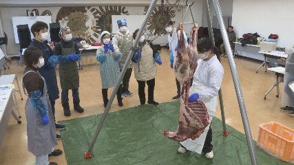 去年から遠野ではジビエ事業が始まっています。そうしたなか、ジビエ事業について学ぶツアーイベントが先週土曜日に初めて開かれました。遠野ジビエ探求ツアーはシカ肉の解体を体験したりジビエ料理を食べたりすることで「命」や「食」の大切さを再認識してもらおうと、遠野旅の産地直売所が初めて開催しました。ツアーには県内外から6人が参加し初めに市立博物館を見学したあと、市民センターに移動しシカの枝肉の解体体験に挑戦しました。参加者たちは遠野ジビエの里の木村美智さんがシカ肉を肩やロース、ヒレなど部位ごとに切り出す様子を見学したあと、包丁を握り体験しました。部位ごとの切り出しが終わったあとはスジや膜などを取り除くトリミングを行い、参加者たちはふだん食べている肉が複雑な工程を経て販売されていることを実感した様子でした。また作業中は、ここ数年シカによる農作物への被害が深刻なことやジビエとして活用が始まってからまだ1年が経過していない、遠野市内の現状についても説明されました。解体体験のあとは「おのひづめ」でディナーが開かれ、参加者が自ら解体したシカ肉のロース・モモ・アバラが使われたコース料理が提供されました。なおツアーの最後には夜行性動物の生態観察を行うナイトサファリも行われ、参加者たちは様々な体験を通じて遠野の鳥獣害やジビエについて理解を深めたようです。Copyright(C) TonoCableTelevision. All rights reserved.