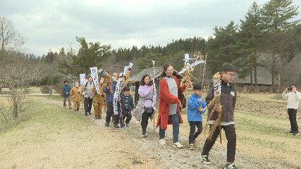 五穀豊穣や家内安全などを願う春風まつりが今週日曜日遠野ふるさと村で開かれました。春風まつりはことし1年の「五穀豊穣」や「無病息災」などを祈願する遠野の年中行事で、毎年この時期にふるさと村で行われています。この日は、まぶりっと衆や市内外から訪れた観光客などおよそ20人が集まるなか、はじめに、福を呼び込むのぼり旗に願いを記し、災いの身代わりとなる藁人形の顔を描きました。旗や藁人形が完成した後は「春風まつるよ」と声をそろえながら村内にある稲荷神社までおよそ10分かけてゆっくりと練り歩きました。また、稲荷神社に到着した一行はのぼり旗と藁人形を納めことし1年の「家内安全」などを願っていました。春風まつりの最後には餅つき体験も行われ、参加者たちは楽しみながら遠野の伝統文化に親しんでいました。なお、遠野ふるさと村では、今後も季節に応じたイベントを実施していく予定だということです。Copyright(C) TonoCableTelevision. All rights reserved.