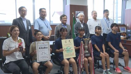 先月8月に陸上競技の東北大会に出場した選手たちが、先週木曜日市役所とぴあ庁舎を訪れ、市長に報告しました。この日は市の職員が拍手で迎える中、東北中学校陸上競技大会で総合優勝を果たした遠野中学校女子陸上部の3人をはじめ6人の選手がとぴあ庁舎を訪れました。遠野中学校陸上部は、先月開催された東北中学校陸上競技大会に4人が出場しました。結果、1年生の菊池香春さんが女子1年1500メートルにおいて4分55秒44のタイムで3位。3年生の浜川那々子さんが女子2・3年1500メートルで自己ベストを更新する4分36秒42のタイムで3位。そして、釘拔舞凛さんは、女子共通走幅跳で6位と出場した3人が入賞を手にし、遠野中学校陸上部女子が総合優勝を果たしました。また2年生菊池空羽さんは男子2年100メートルに出場し、16位の成績を収めました。さらに遠野ランニングクラブに所属する遠野小学校5年生中舘椿希さんは、東日本都道府県小学生陸上交流大会において、男子5年100メートルで14秒09のタイムで6位に入賞しました。また同じく遠野ランニングクラブ所属の佐々木千聖さんは、東北総合スポーツ大会陸上競技の女子100メートルを12秒05のタイムで走り1位、女子200メートルでは23秒89で3位に輝きました。この日は東北大会に出場した6人が大会を振り返り報告しました。報告を受けた多田市長は「将来がさらに楽しみになりました」と選手の活躍を称えました。Copyright(C) TonoCableTelevision. All rights reserved.