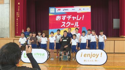「あすチャレ!スクール」が今年度も市内の小中学校で開かれ、男子車いすバスケットボール元日本代表選手による講話などが行われました。あすチャレ!スクールは、パラアスリートを中心とした講師たちが伝えるリアルから、これからのより良い社会を創り出していくためのヒントや気づき、そして明日へのチャレンジのきっかけにしてもらおうと、日本財団パラスポーツサポートセンターが全国開催しています。先週木曜日は上郷小学校で開かれ、体育館に集まった5・6年生が講師の先生を拍手で迎えようとすると、まさかの後ろからの登場で児童たちを驚かせました。今回講師を務めた神保康広さんは、パラリンピック4大会出場の男子車いすバスケットボール元日本代表選手です。車いすと車いすが激しくぶつかり合うシーンも多く見られる車いすバスケットボールですが、神保さんは初めに、競技用車いすの特徴や乗り方について説明し、正しく乗ることで競技が安全に進められていることを児童たちに伝えました。続いて、神保さんは、車いすバスケットボールのルールについて説明し、ロングシュートを見事に決めると児童たちは大喜び、活気みなぎる中、車いすバスケットボールの体験も行われました。このあと、大人たちによるスペシャルマッチも行われ、ボール運びに手こずりながらもなんとか決めた1点に児童たちも大盛り上がり、車いすバスケットボールの楽しさや難しさを学んでいました。最後は、講話が行われ、大事なものを諦めてしまった過去や素直になれなかったことへの後悔、オートバイでの事故で歩けなくなった時に励まし応援してくれた友達の存在など、これまでの経験が伝えられました。神保さんは現在、「スポーツで世界を一つにしたい」を明日へのチャレンジとして、途上国や中進国でもパラスポーツの普及活動に取り組んでいます。さまざまな国での活動を通して神保さんが児童たちに贈ったアドバイスは行動することの大切さや楽しむことでした。なお、あすチャレ!スクールは、今週金曜日まで市内の小中学校で開かれています。Copyright(C) TonoCableTelevision. All rights reserved.