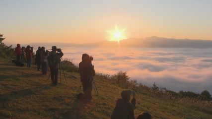 続いては秋の風物詩の話題です。市内では「雲海」が連日発生し、松崎町の高清水展望台では多くの人がこの時期ならではの絶景を楽しんでいます。先週金曜日、高清水展望台には辺りが真っ暗なうちから30人ほどが集まり雲海を眺めていました。波のようにうねる様子はまさに雲の海≠ナす。そして午前5時30分ごろ山頂から朝日が顔を出すと、集まった人たちはスマートフォンや一眼レフカメラで朝焼けに染まった雲海を撮影していました。沿岸の山田町から初めて訪れたというこちらの家族は。雲海は天候や気温などの条件がそろえば11月まで発生します。いつもより早起きして幻想的な自然の風景を楽しんでみてはいかがでしょうか。Copyright(C) TonoCableTelevision. All rights reserved.