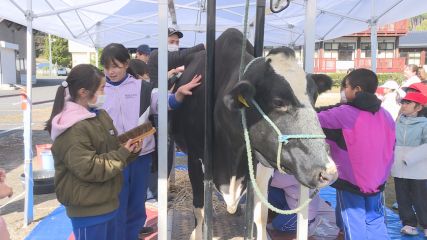 酪農について学ぶ体験型の出前授業が、先週水曜日に綾織小学校で行われました。出前授業には綾織小学校の2年生から5年生が参加し、酪農家の仕事や普段飲んでいる牛乳がどのように作られているのかを学びました。初めにJA全農いわての菊池真永さんがホルスタイン種の特徴について説明し、胃が4つもあることや体重が600キロ以上あることを伝えました。続いて県内で生産された3種類の牛乳を飲み比べて、星のマークがついた牛乳がどれなのかを当てるクイズが行われ、児童たちは匂いや味の違いをじっくり確かめていました。飲み比べのあとはバター作りを体験。クリームが入ったカップを10分ほど振ってバターを作り、クラッカーに塗って試食しました。そして出前授業の最後には校庭で牛とのふれあいが行われました。2頭の乳牛を連れてきたのは、上郷町の酪農家佐野茂樹さんです。ふれあい体験ではブラッシングや乳しぼりをしたほか、生後3カ月の子牛にミルクをあげたり聴診器で心臓の音を聞いたりしていました。綾織小学校の児童たちは様々な体験を通じて乳牛や酪農家の仕事、普段口にしている乳製品などについて理解を深めた様子でした。Copyright(C) TonoCableTelevision. All rights reserved.