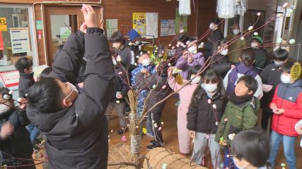 五穀豊穣や作物の豊作を祈る小正月行事が、先週金曜日に上郷地区センターで行われました。この行事は古くから伝わる小正月の風習を世代間で交流しながら次の世代に伝え、地域を大切にする心を育もうと上郷町地域づくり推進協議会が毎年この時期に行っています。この日は上郷児童館を利用する小学生と上郷保育園の園児、更生保護女性の会のメンバーなどおよそ60人が集まり、五穀豊穣を祈る「みずき団子作り」や、作物の豊作を祈る「烏よばり」と「お田植え」が行われました。このうち色とりどりの団子をミズキの枝に飾り付ける「みずき団子作り」では、更生保護女性の会のメンバーが用意した生地を小学生と保育園児が協力しながら団子の形に丸めていきました。そのあと湯がいた団子を鯛やオカメ、小判といった縁起物の飾りとあわせて子どもたちがミズキの枝に丁寧に飾り付けました。子どもたちは地域の人たちに教わりながら昔ながらの行事に触れ、その意味や願いを楽しみながら学んでいる様子でした。なお飾り付けられたミズキは、上郷地区センターの玄関ホールに1週間ほど飾られるということです。Copyright(C) TonoCableTelevision. All rights reserved.