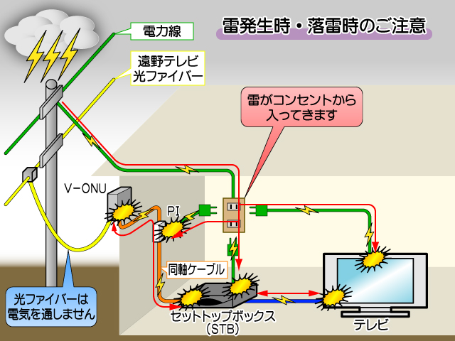雷の影響により、セットトップボックス(STB)やテレビなど、宅内の機器に障害が発生する場合があります。