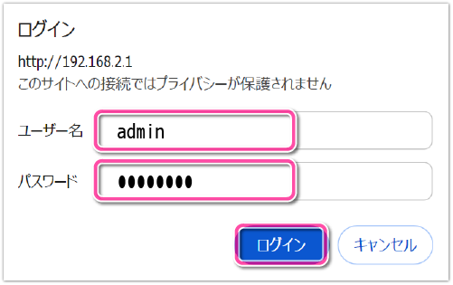 ユーザー名の欄とパスワードの欄に、Wi-Fiルーターの管理画面や設定画面にアクセス(ログイン)できるユーザー名とパスワードを入力し、ログイン(サインイン)をクリックしてください。