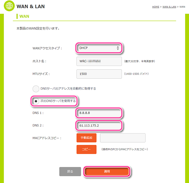 WANの画面が表示されたら、以下の4つの項目について設定してください。