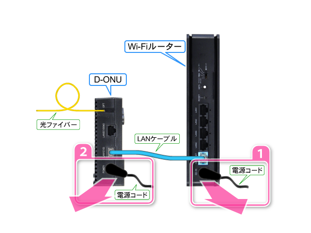 Wi-FiルーターとD-ONUの電源コードを抜いて数分お待ちください。