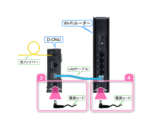 D-ONUの電源コードを入れ数分お待ちください。 その後、Wi-Fiルーターの電源コードを入れ数分お待ちください。 D-ONUとWi-Fiルーターが起動したら、インターネットに接続できるかご確認ください。