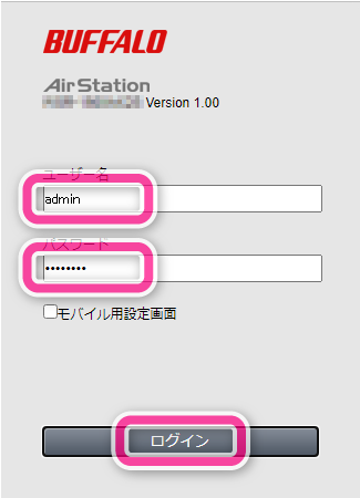 ユーザー名の欄にadminなどの機器ログイン用ユーザー名を、パスワードの欄に機器ログイン用パスワードを入力し、ログインを押してください。