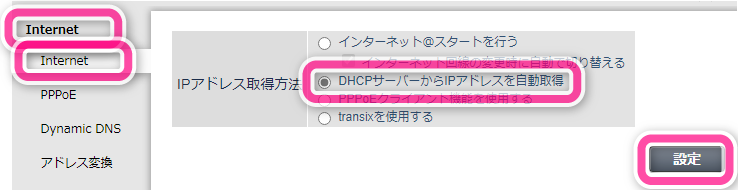 IPアドレス取得方法の欄でDHCPサーバーからIPアドレスを自動取得を選択し、設定を押してください。