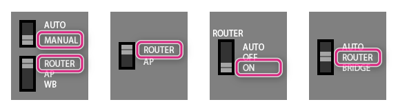 MANUAL−ROUTER、ROUTER、ROUTER ONなど、ルーター機能が有効になるように設定し、Wi-Fiルーターの電源を入れなおしてください。