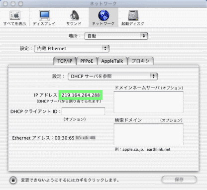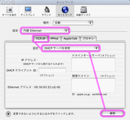 次に、[TCP/IP]タブを選択し、設定を[DHCPサーバを参照]を選択し、 [保存]をクリックしてください。