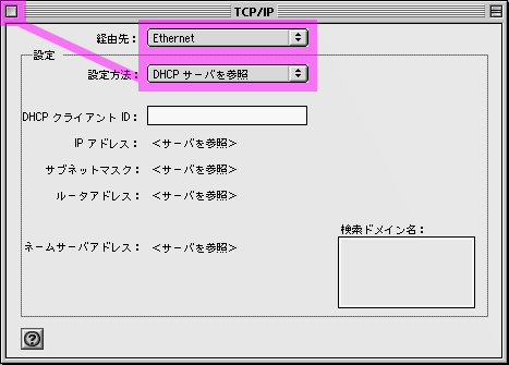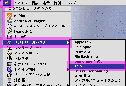 [アップルメニュー]から[コントロールパネル]→ [TCP/IP]を選択してください。