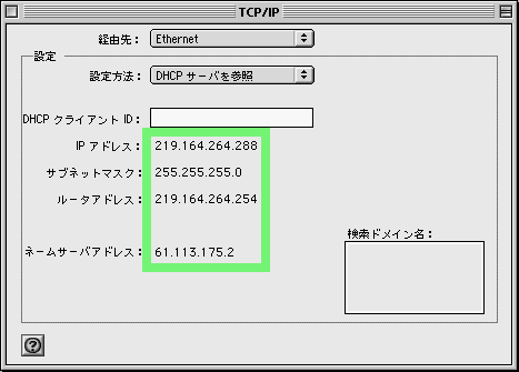 もう一度開くと、DHCPサーバから取得したIPアドレス、サブネットマスク、ルータアドレス、ネームサーバアドレスを見ることが出来ます。