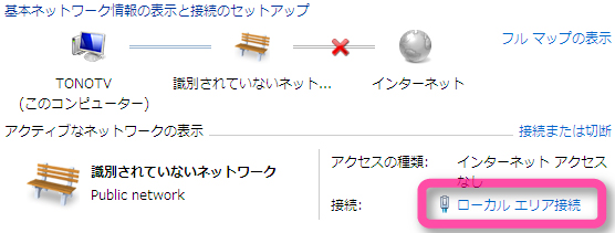 識別されていないネットワークの右欄にある[ローカルエリア接続]をクリックしてください。