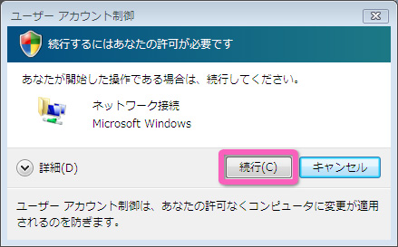 もし、ユーザーアカウント制御のウィンドウが開いたら[続行]をクリックしてください。