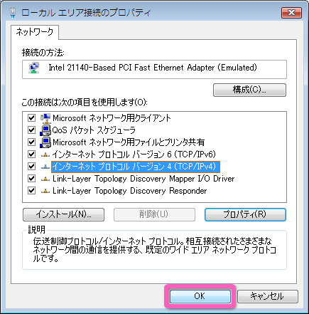 ローカルエリア接続のプロパティのウィンドウに戻ったら [OK]をクリックしてください。