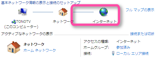 ネットワークと共有センターに認識されていないネットワークと白黒の地球アイコンなっているインターネットの間に×印がついています。