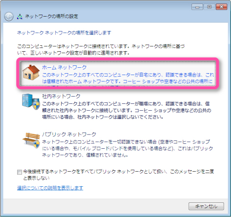 「ネットワークの場所の設定」画面が表示された場合は、通常、[ホームネットワーク]を選択してください。この設定はご利用のネットワーク環境に応じて選択してください。
