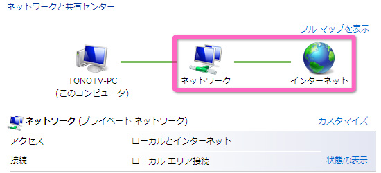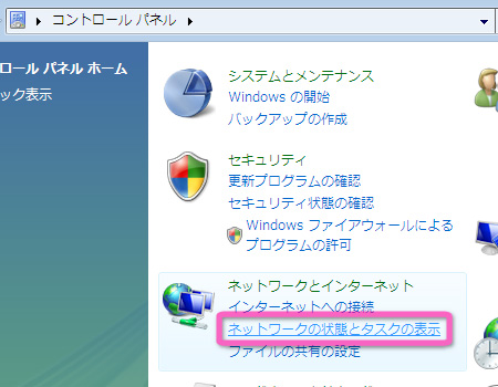 [コントロールパネル]から[ネットワークとインターネット]の中の [ネットワークの状態とタスクの表示]をクリックしてください。