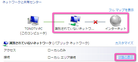 基本ネットワーク情報の表示と接続のセットアップに認識されていないネットワークと 白黒の地球アイコンなっているインターネットの間に×印がついています。