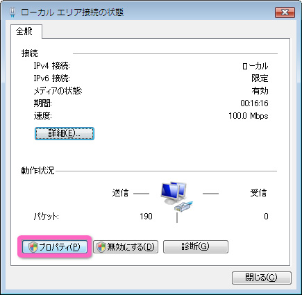 ローカルエリア接続の状態のウィンドウが開いたら、 [プロパティ]をクリックしてください。