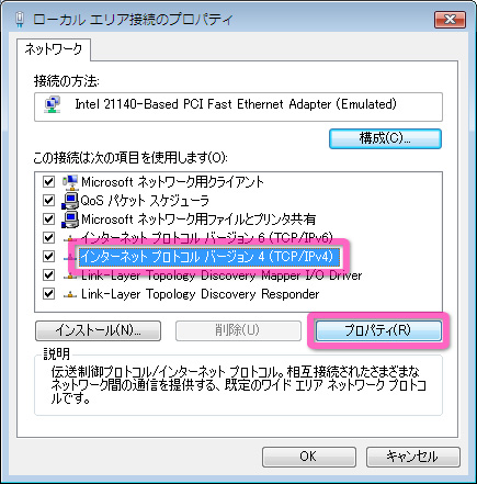 ローカルエリア接続のプロパティのウィンドウが開いたら [インターネットプロトコルバージョン4(TCP/IPv4)]をクリックし、 [プロパティ]をクリックしてください。