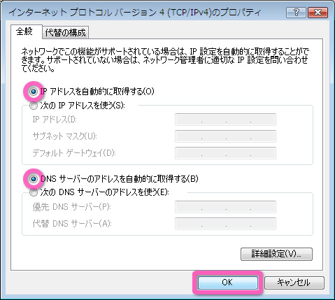 ローカルエリア接続のプロパティウィンドウに戻ります。 [IPアドレスを自動的に取得する]と [DNSサーバーのアドレスを自動的に取得する]を選択し、 [OK]をクリックしてください。