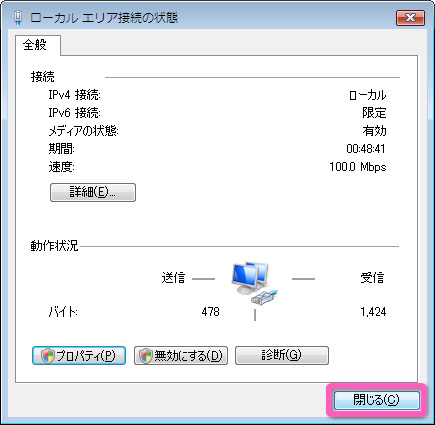[ローカルエリア接続の状態]のウィンドウに戻ったら [閉じる]をクリックしてください。