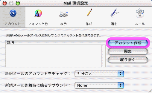 Mail環境設定ウィンドウが表示されたら[アカウント作成]をクリックしてください。