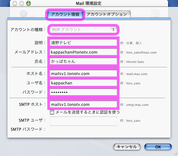 アカウント情報のタブが表示されますので、ユーザ情報通知書の内容を各項目に入力してください。