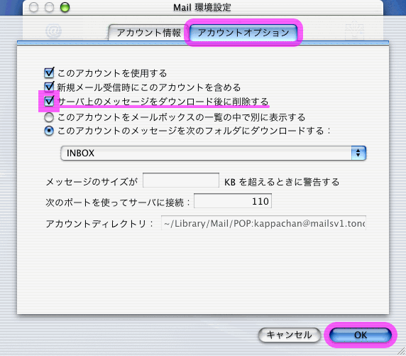 [サーバ上のメッセージをダウンロード後に削除する]の項目にチェックマークをつけます。