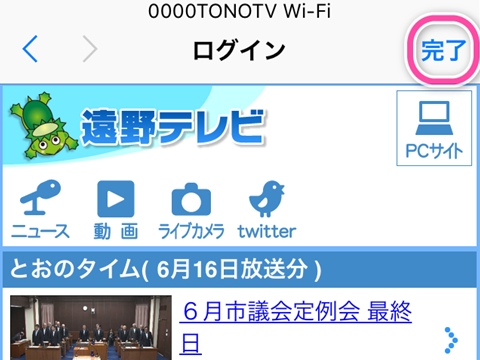 ログインに成功すると遠野テレビのホームページが表示されます。完了をタップしてください。