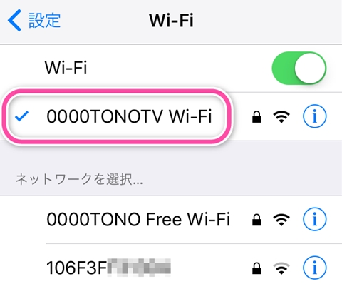 Wi-Fi画面に戻ると、0000TONOTV Wi-Fiの先頭にチェックマークが表示されます。