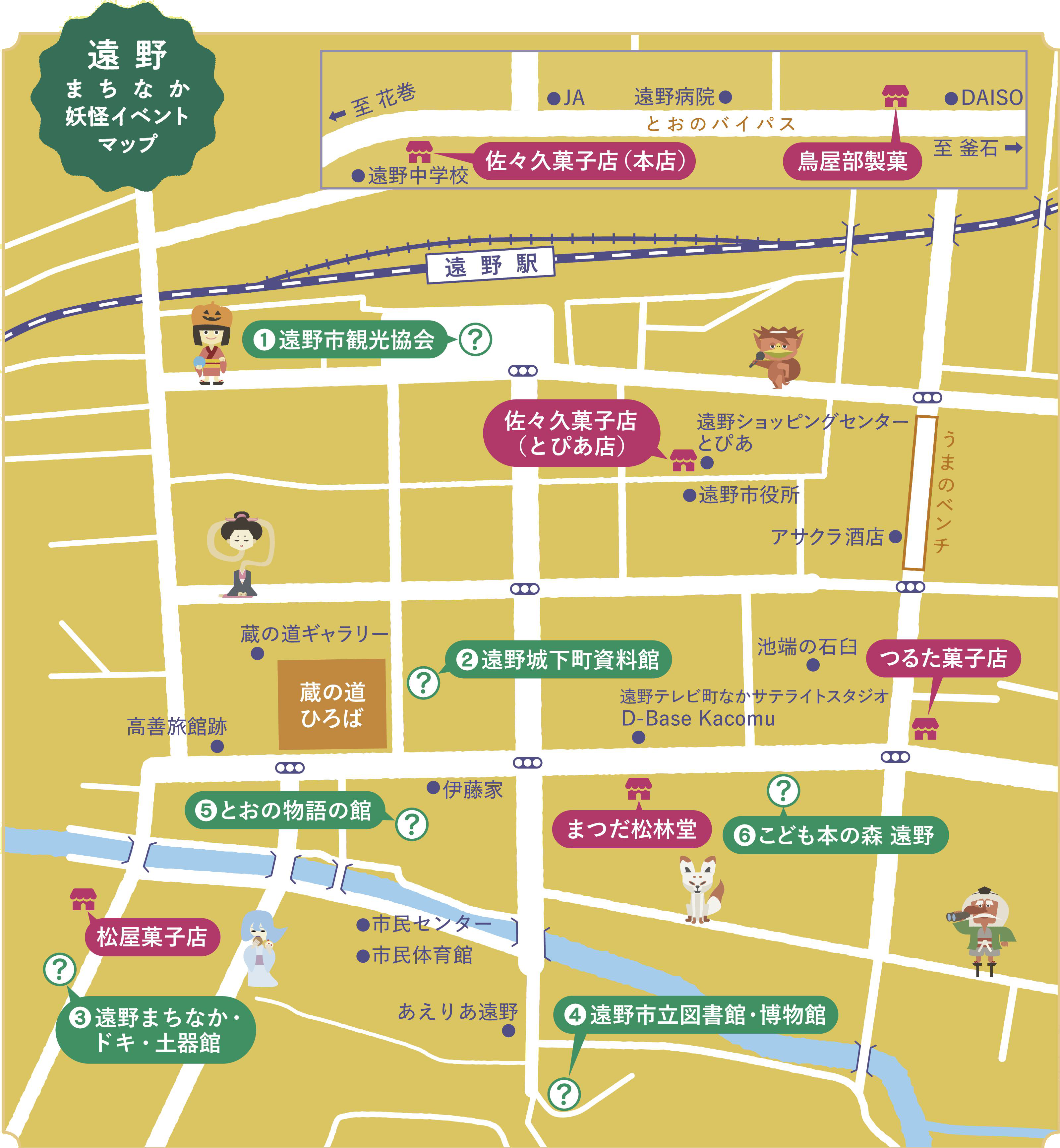 設問ポイント②~⑥のなぞ解きスポットを巡って、ここでしか手に入らない限定グッズをゲットしよう!すべてクリアできなくても、参加者全員に記念缶バッジをプレゼント!受付およびゴールは遠野市観光協会となります。